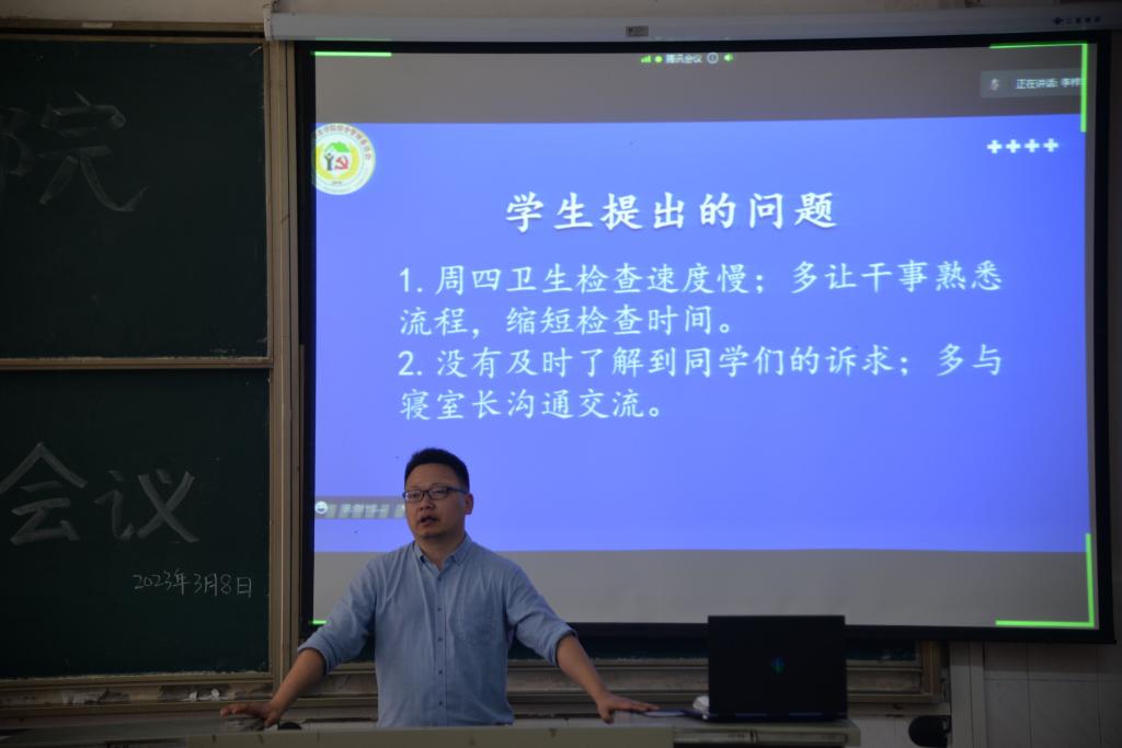 会议伊始,付雪娇老师向参会同学表达了问候和欢迎,感谢大家对寝室建设工作的大力支持。她强调:集团是一个大家庭,寝室是一个小家庭,寝室长们要以身作则,主动作为,带头营造一个良好的寝室氛围。