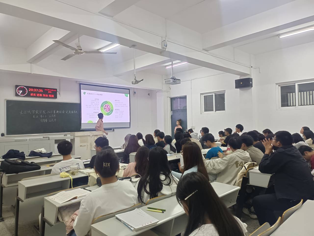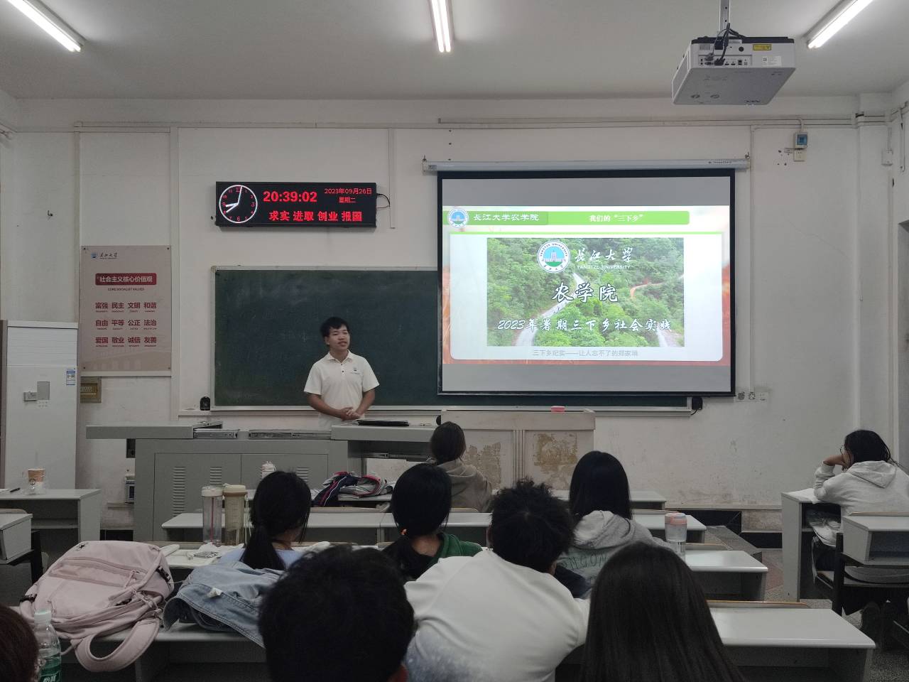 在本次分享会中,3044am永利集团暑期社会实践服务队的队员们分为了八个小组,分别到新生所在的五个自习教室进行宣讲。本次宣讲中,实践队员们从什么是“三下乡”活动、2023年暑期“三下乡”活动经验分享以及未来的“三下乡”三个方面向23级新生作了详细介绍。
